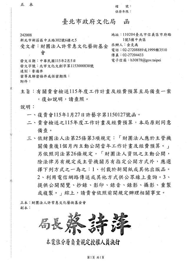 財團法人許常惠文化藝術基金會115年度工作計畫暨預算完成核備