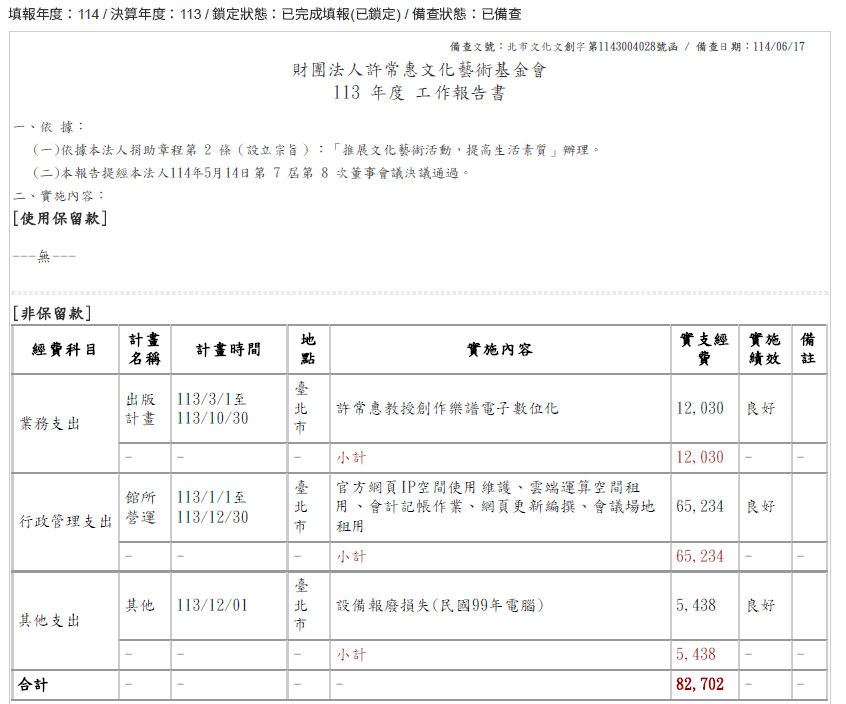 財團法人許常惠文化藝術基金會113年度工作計畫暨結算公告(完成核備)